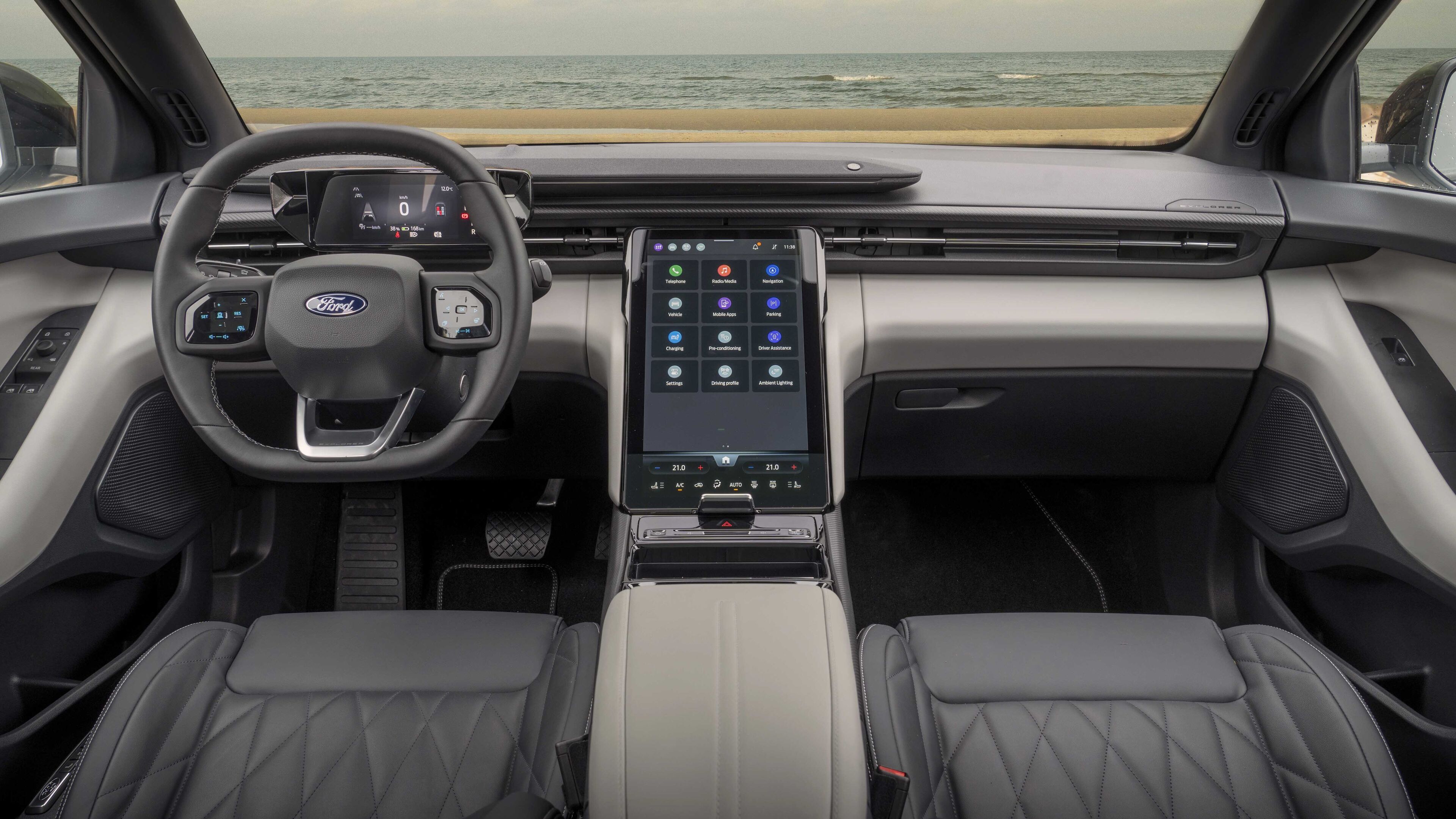 Still, its driver display is bigger than the Explorer’s, which makes do with the famously minimal VW one. It does however swap out VW’s touchscreen for a really big Ford-specific one. It’s straightforward to use, legible, usefully configurable and generally a model of logic. Or at least its logic corresponds with the operating system of my own brain – one must recognise these things are personal. That screen also pivots electrically so you can make it more streamlined and discreet, or higher and more reachable.