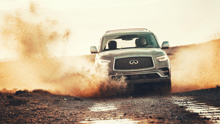 I last about, ooh, 50 yards before realising I’m not cut out for this responsibility. The drive back across the desert is too tempting, I just know I’ll get carried away and forget the precious cargo until I see it bouncing off the ceiling as I gaily sail off another crest. With the other QX80 acting responsibly, I’m free to lark about. It’s no rally car, the flat seats need more bolstering, and underneath it’s little more than a reskinned Nissan Patrol. But that makes this behemoth ideal for this landscape. Lantern-jawed and teak-tough, but with a hint of luxury to help while away the hours.