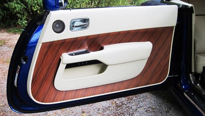 The call of nature again. I'd rather pee in a bush than risk another lay-by, so I find a quiet junction and head down a suitable-looking B-road. I love getting in and out of the Wraith. Well, the getting out anyway. You just step out forwards. Getting back in is more complex: you have to approach and twist through 180 degrees. Two things make that happily tolerable. The doors whirr shut electrically via a button if you want; and you get to see the inside of the doors as you approach the car. I think the door card, as it's officially known, is the best detail on the whole car. It's an uninterrupted piece of veneer, a real statement.