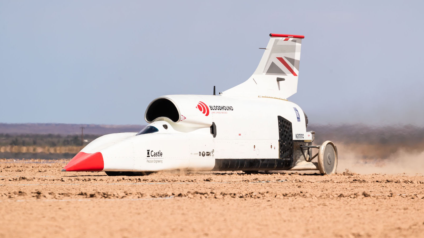 And it’s not going flat out. The acceleration figures we got from Bloodhound at Newquay a couple of years back, where it narrowly topped 200mph, were quite a bit faster. There 60-130mph was blitzed in a staggering 2.12secs. On Hakskeen Pan it took 3.8secs (for comparison, both the Porsche 935 and Ferrari 488 Pista take 5.5secs).