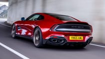 That V12 gets a new block, heads, ports, camshafts, connecting rods, turbochargers, fuel injectors, and relocated spark plugs. The turbos are low-inertia, higher-speed items, and there’s ‘boost reserve’ where the electronic wastegate and intake port work together to preserve some pressure when momentarily off-throttle, ready to re-introduce it when you get back on the gas. It’s not hugely noticeable without trying the engine without the system fitted, but the Vanquish certainly has some mid-range flexibility. Honestly, this thing fires through a decent straight like the horizon owes it money.