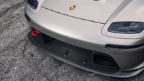 Meanwhile the engine modifications are the work of Porsche specialist engine tuner Rothsport Racing. The block is original. Almost nothing else is. It revs to 8,000rpm, sounds fabulously harsh and angry and the only water-cooling on the car is for the intercooler air. Cooling air for the flat six is pulled in through the engine cover, the fan blowing vertically down through a carbon shroud to maximise efficiency. Engine air is pulled in from the wheelarch inlets, the tracts as straight as possible to ram air into the turbos.